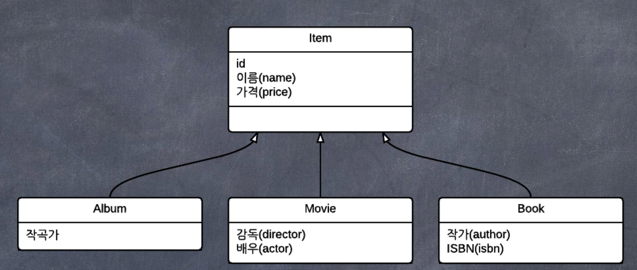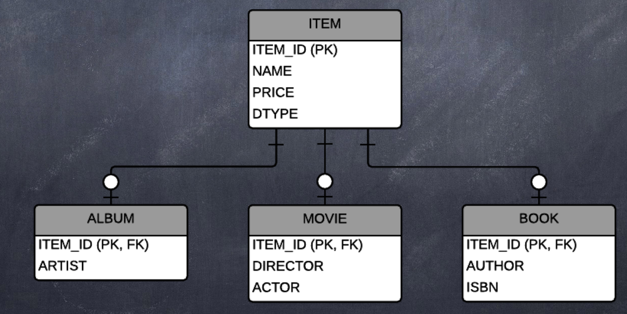 Item 테이블의 DTYPE컬럼을 사용하면 어떤 자식 테이블과 관계가 있는지 정의할 수 있다. 예를 들어 DTYPE값이 MOVIE라면 영화 테이블과 관계가 있는 것 이다.