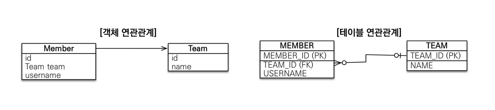 객체는 참조를 사용해 다른 객체와 연관관계를 가지고 참조에 접근해 연관된 객체를 조회한다. 반면, 테이블은 외래 키를 사용해 다른 테이블과 연관관계를 가지고 조인을 사용해서 연관된 테이블을 조회한다.
